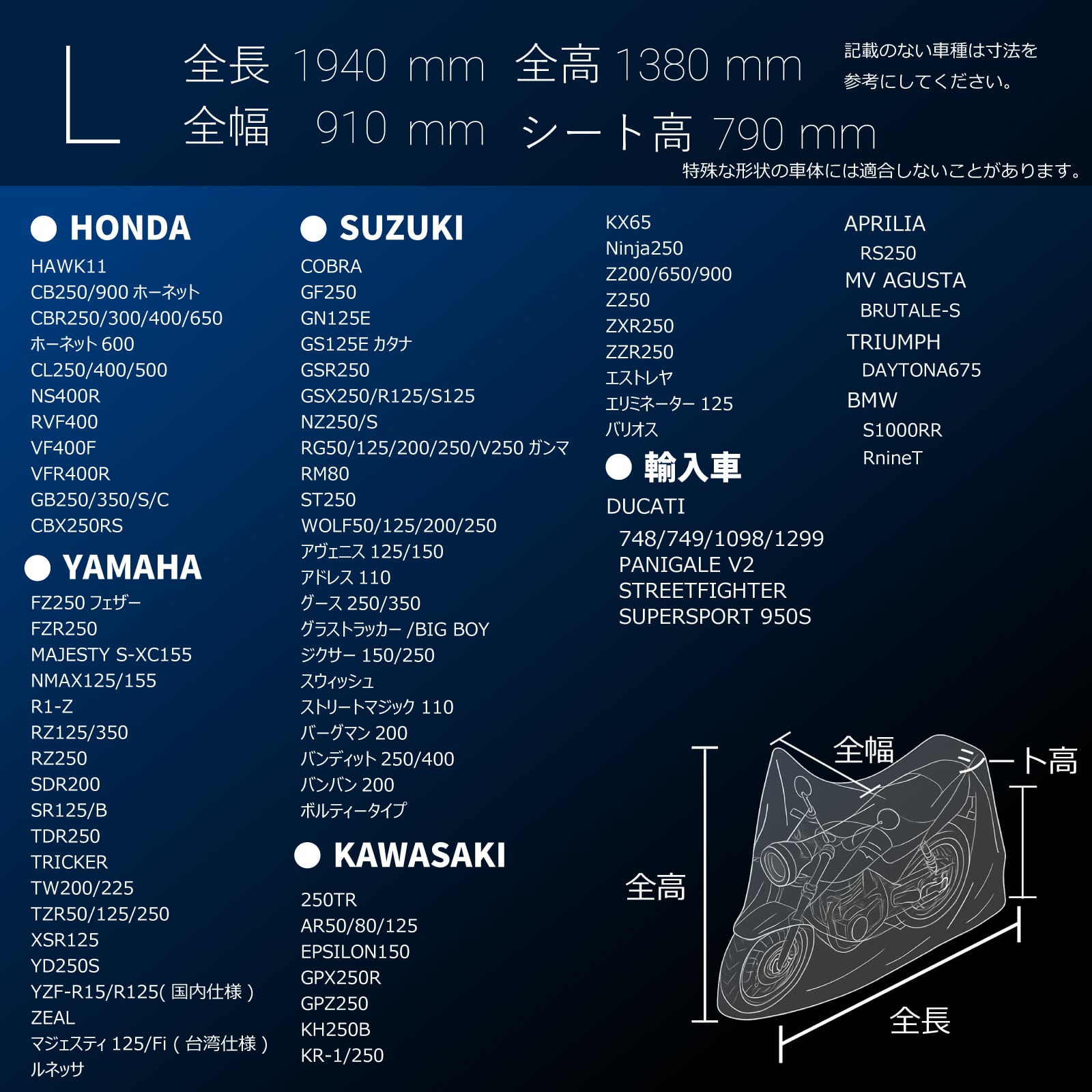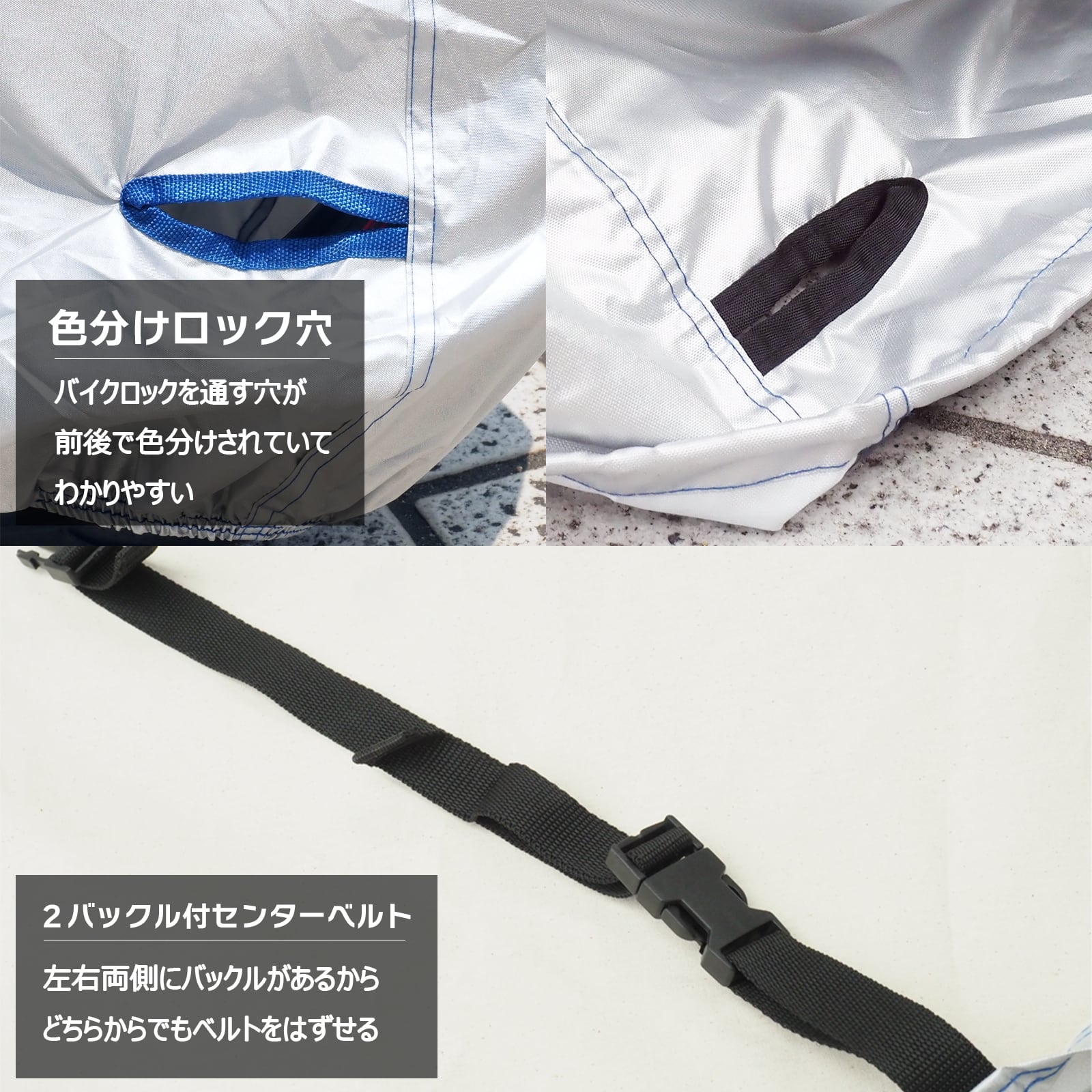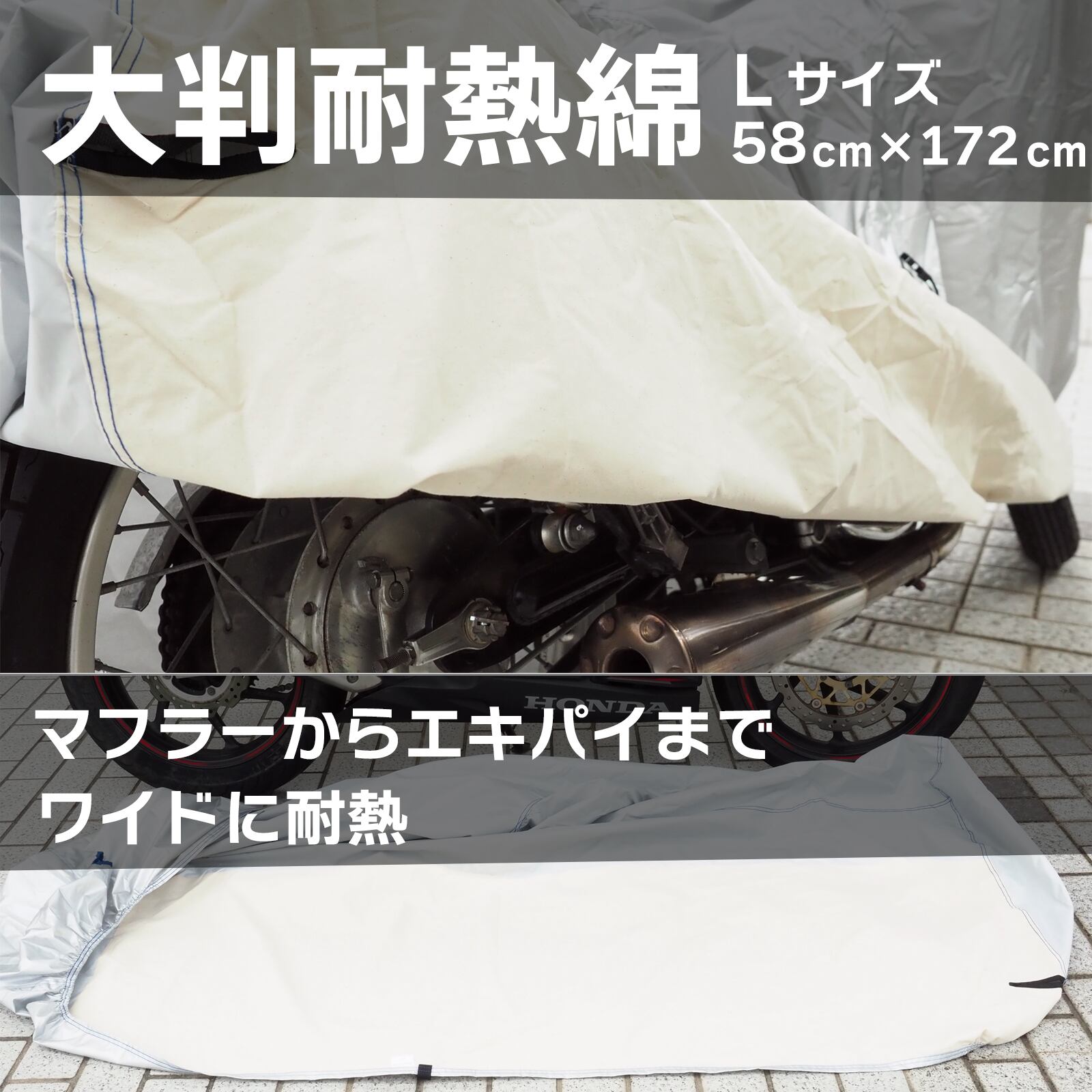 大判の綿製耐熱シートを広範囲に貼り付けており、マフラーの熱による溶けや破れを効果的に防止します。前後のロックホールは色分けされているため、装着時に前後がすぐに判別でき、毎日のカバーの着脱がスムーズです。さらに、防水仕様で雨天時も安心。風飛び防止用のセンターベルトは両側から開閉でき、操作性にも優れています。L・LL・3Lの3サイズ展開で、原付から大型バイクまで幅広く対応。機能性と耐久性を兼ね備えた、愛車を長く守るためのバイクカバーです。